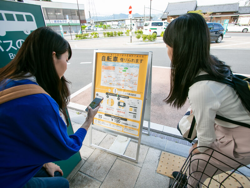 穂高駅前で自転車をレンタルして出発。穂高駅前にはレンタサイクル店と乗り捨て自由なシェアサイクルがあります。