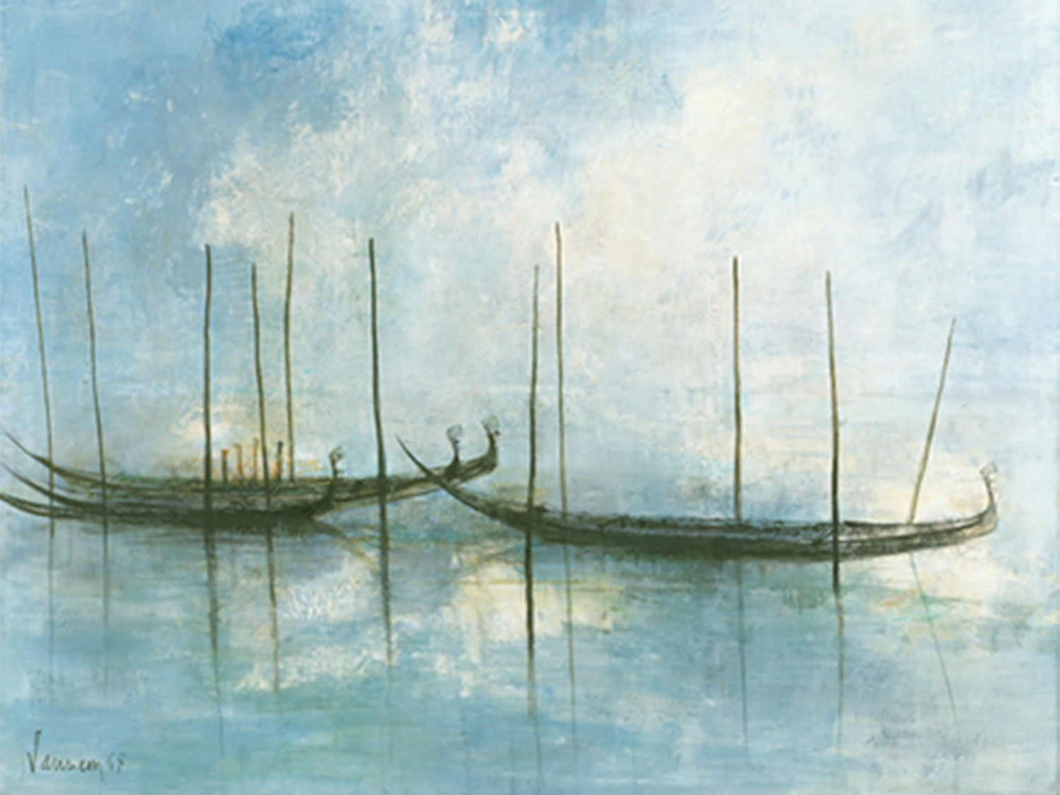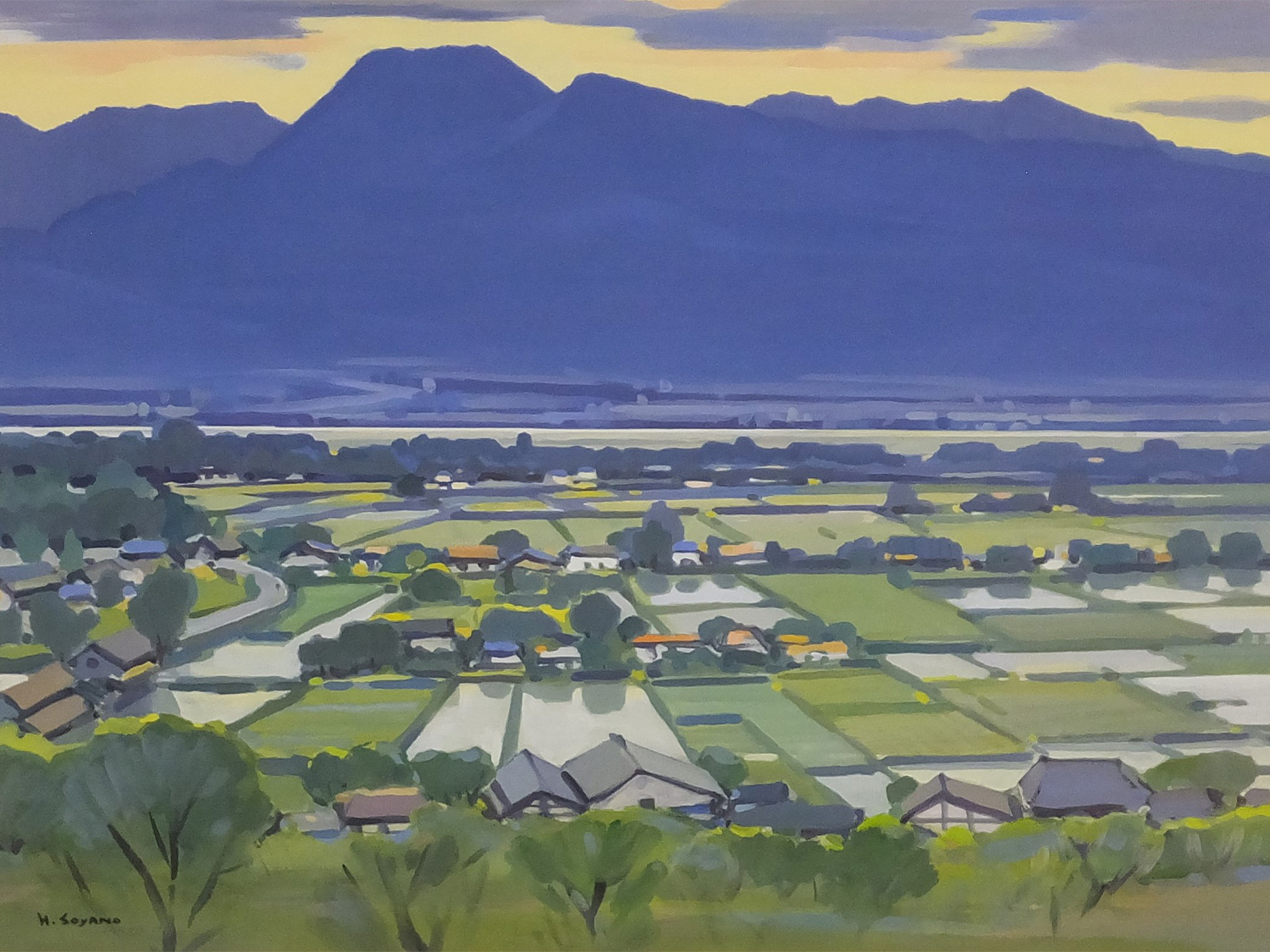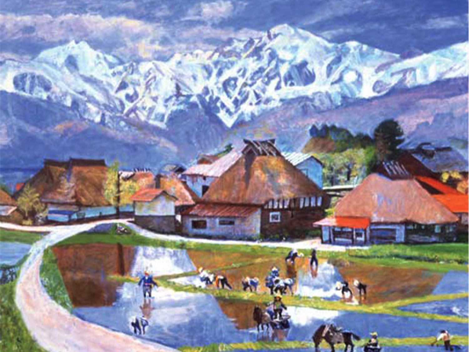 水田に映る北アルプス、残雪の常念岳、夕映えの有明山…安曇野の魅力を独特のタッチと群青の色使いで描いた画家「征矢野 久」の作品の数々をご覧下さい。