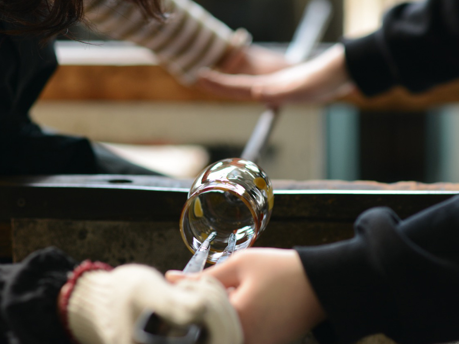 安曇野にちなんだガラス作品を制作、販売しています。 また、ショップからは制作風景をご覧いただけます。 当日受付で吹きガラス体験も実施しております。内容はHPをご確認ください。