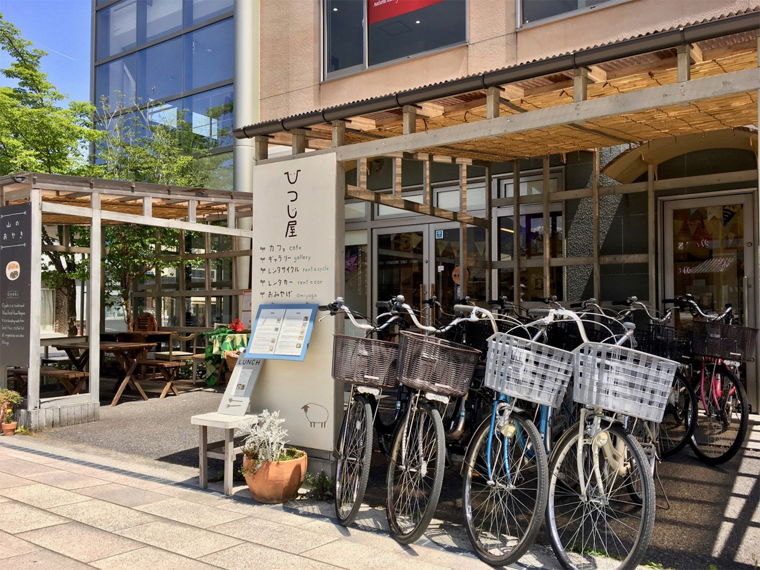 ひつじ屋は穂高駅のすぐ前。レンタサイクル、レンタカーの他、人気のカフェや、おみやげコーナーもあります。お待ち合わせ、電車やバスの待ち時間にどうぞ。Wi-Fi完備。