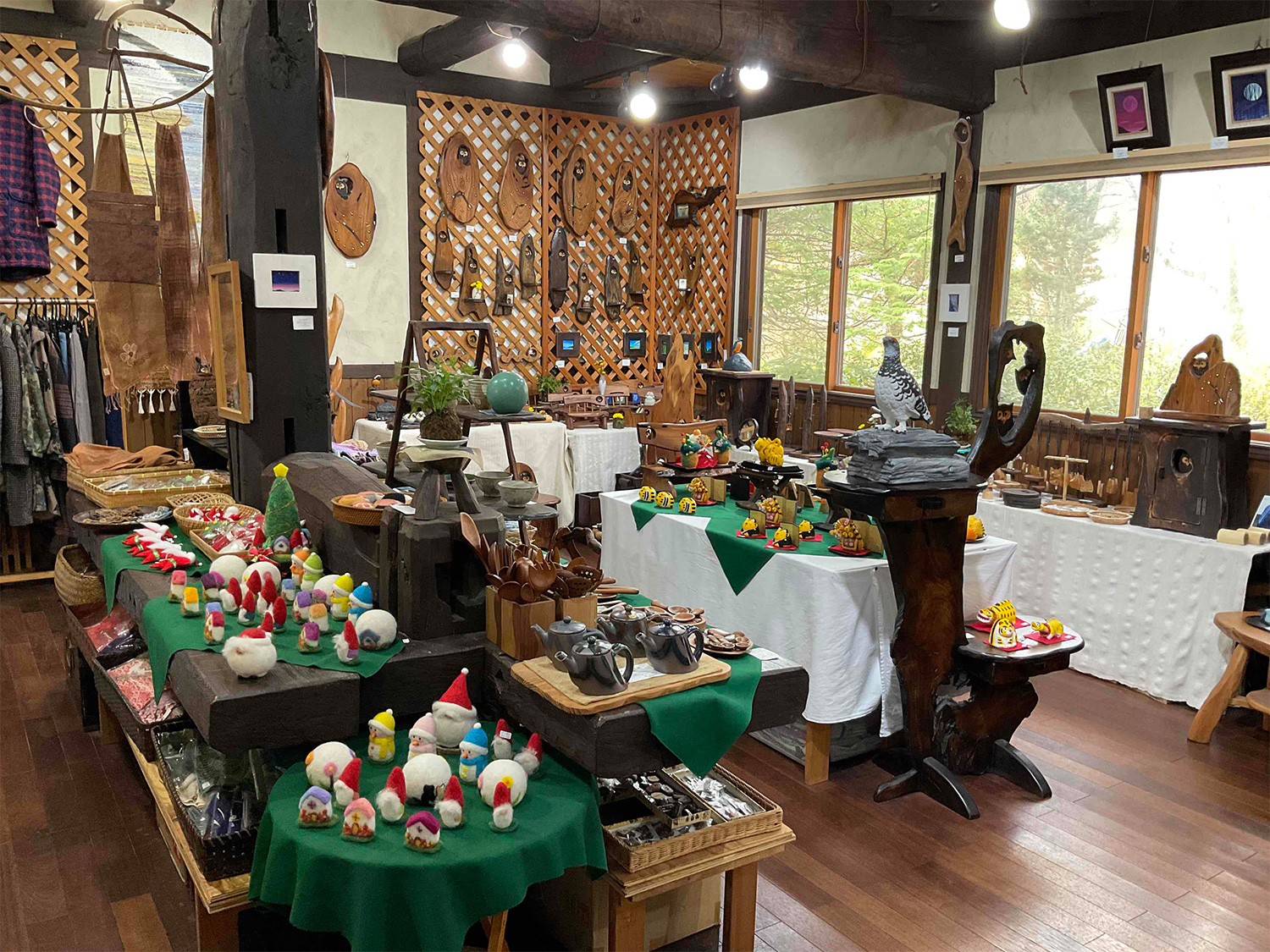 工房ぬく森の木工品やバードカービングを中心に、手作りの服やバッグを常設。またクラフト作家の個展や企画展を2~3週間毎に入れ替えて開催しています。