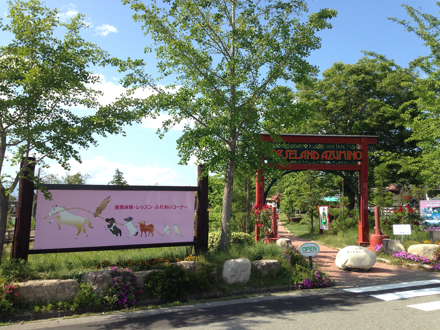 安曇野スイス村エリア内にある乗馬施設。小さなお子様からご年配の方まで、未経験でも乗馬が楽しめる。 ポニーやヤギとふれあったり、エサ(1皿100円)もあげられる。