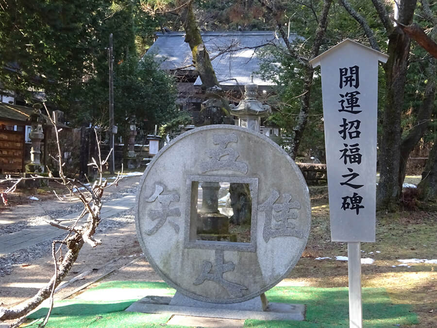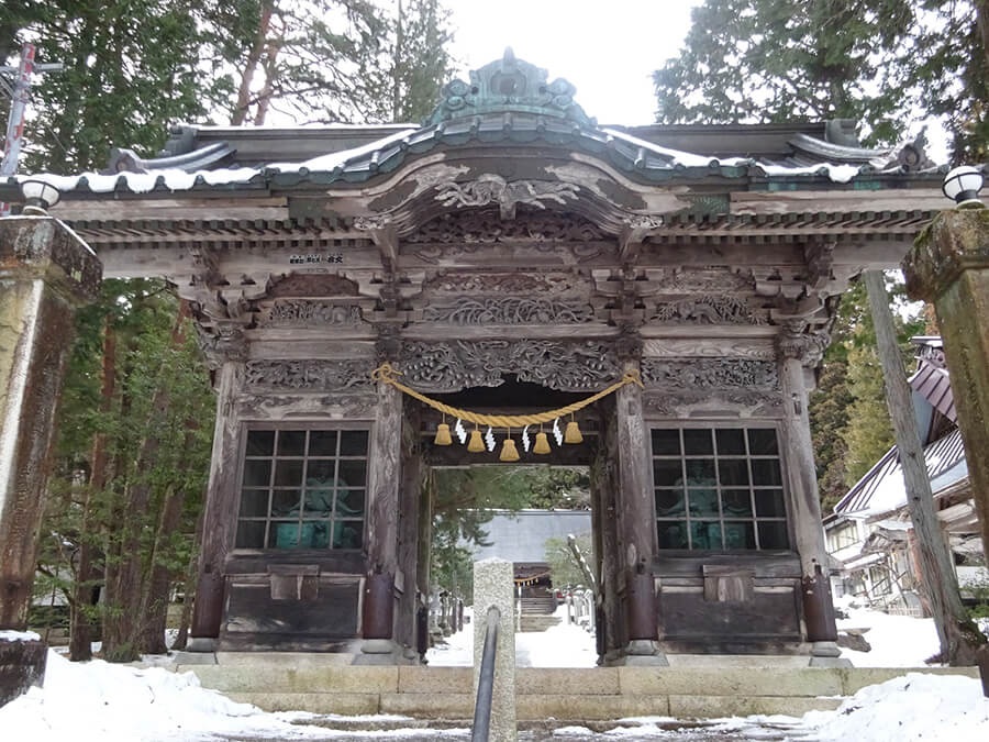 標高743mの境内は四月中下旬に桜が満開となり名所となっている。手水舎と裕明門には龍、鳳凰、十二支等の彫刻が施されている。通路の天井絵も見ごたえがある。